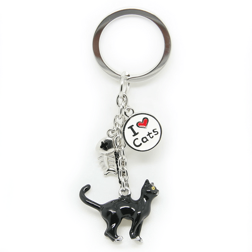 Metalowy, bardzo starannie wykonany brelok przedstawiający czarnego kota. Oprócz kota do breloka przymocowane są tabliczka "I love cat", rybi szkielet i tabliczka napis Polska.