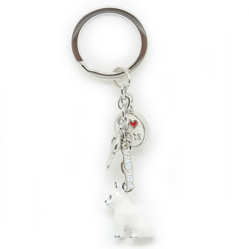 Metalowy, bardzo starannie wykonany brelok przedstawiający białego, małego kotka. Oprócz kota do breloka przymocowane są tabliczka "I love cat", rybi szkielet i tabliczka napis Polska.