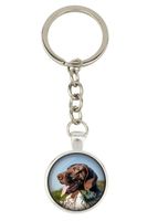 Okrągły brelok z wyraźnym zdjęciem zatopionym pod wypukłym szkiełkiem w metalowej oprawie w kolorze srebra.