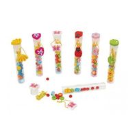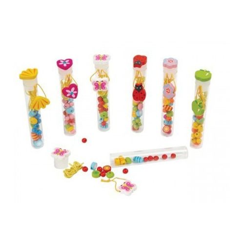 Koraliki drewniane w tubie. W zestawie 18 elementów.
