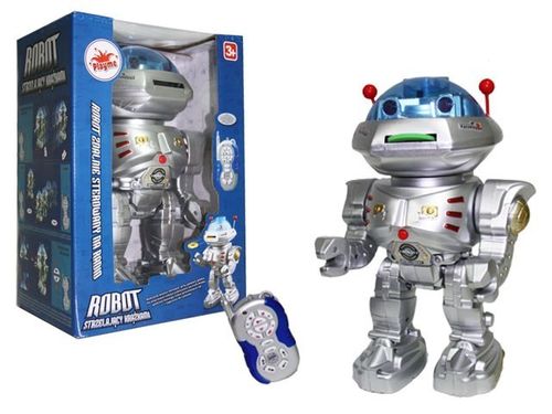 Robot zdalnie sterowanyStrzela krążkami z miękkiego tworzywa. Chodzi w przód i w tył. Kręci głową i porusza rękoma. Po wciśnięciu odpowiedniego przycisku, robot zaczyna tańczyć. Wymagane baterie: 4xAA - do robota; 2xAA - do pilota (nie dołączone).Wiekod 5 lat