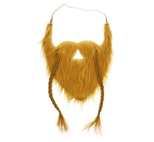 Sztuczna broda z wąsami w kolorze rudym zakładana na gumkę. Po bokach splecione warkoczyki. Otwór na usta. Rozmiar uniwersalny. Długość brody od ust - ok. 16 cm, długość warkoczyków ok. 28 cm.