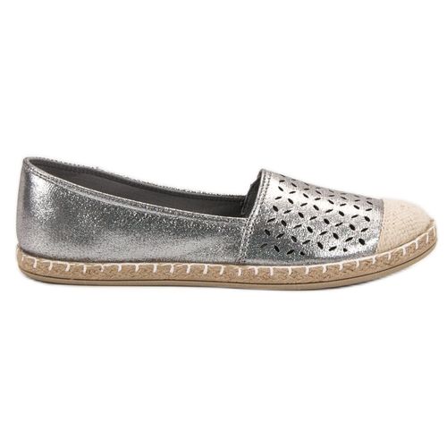 Letnie i super lekkie espadryle w srebrnym odcieniu, które będą doskonałym dodatkiem do każdej stylizacji. Buty pięknie mienią się w słońcu, głównie za sprawą dodatkowego brokatu, którym są pokryte. Na uwagę zasługują także niewielkie, ozdobne wycięcia na górze butów. Z całą pewnością jest to model bardzo oryginalny.