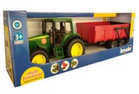 Traktor John Deere z przyczepą marki Bruder, to idealna replika tego ciągnika. Otwierając maskę jego silnika, przekonamy się o realizmie tego modelu, a także staranności jego wykonania. Niezwykłą frajdę z użytkowania zabawkowego traktora, sprawi sterowanie jego przednią osią, za pomocą kierownicy wkładanej przez dach. Aktywne zawieszenie sprawdzi się w każdym, nawet najbardziej nierównym terenie.