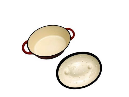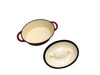 Z zewnątrz brytfanna pokryta warstwą czerwonej, żaroodpornej emalii. Od środka warstwa emalii.