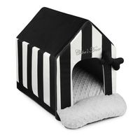 Budka San Marino może być zakupiona pojedynczo lub stanowić piękny zestaw linii San Marino razem z legowiskiem San Marino, boxem na zabawki San Marino, Kocykiem Premium w pasy czy muchą Premium w czarno-białe pasy i torbą Scandinavian w kolorze czarnym.