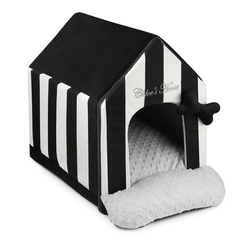 Dach i dół budki Lisbon uszyte są z materiałów o zmniejszonej wchłanialności kurzu i brudu, główną część zaś stanowi wysokogatunkowa bawełna w czarno-białe pasy. Takie połączenie łączy praktyczne aspekty legowiska z ponadczasową elegancją. Przyczepiana nad wejściem do domku na rzep kostka, a także misternie wykonany haft marki Chloe’s House dodają uroku budce. Kolorystyka a także wypełnienie daje poczucie intymności i pozwala się wyciszyć Twojemu czworonogowi.