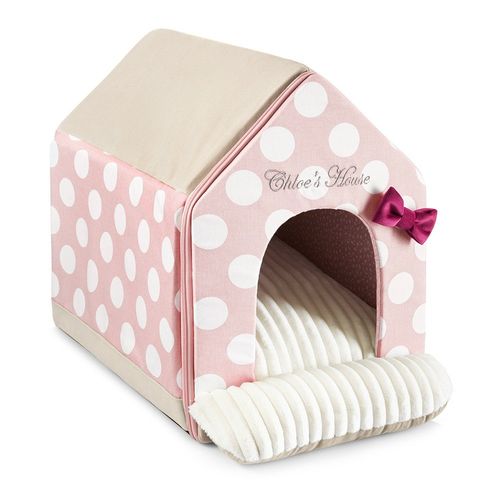 Budka jest uszyta z 2 rodzajów materiałów – bawełny i materiału wyjątkowo odpornego na wchłanianie brudu i kurzu. Delikatny styl materiału w kropki sprawdzi się zarówno do romantycznych jak i nowoczesnych wnętrz. Dla ozdoby przy wejściu przymocowano gustowną kokardę z zamszu. Budka jest w pełni rozkładana. Wejście jest rozsuwane na suwak, dzięki czemu można je odpiąć do prania. Boki budki są usztywnione i w łatwy sposób można je wyjąć i uprać pokrowiec. To zapewnia długotrwały i piękny wygląd legowiska. Dla wygody psa i kota w środku znajduje się wyjmowana poducha, która obszyta jest z jednej strony miękkim kocykiem, a z drugiej przyjemnym w dotyku i jednocześnie bardzo praktycznym materiałem. Wnętrze budki obszyte jest uroczą bawełną w piękne wzorki. Całość wygląda słodko ale także elegancko. Budka Toscany będzie stanowić nie tylko wygodne miejsce do spania i spędzania czasu wolnego Twojego zwierzaka, ale także wpisze się jako piękny dodatek w wystroju mieszkania lub domu.