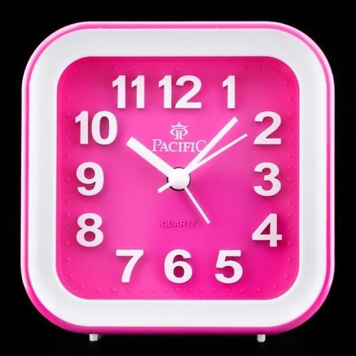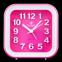 WYMIARY: obudowa: 10,3cm x 10,3cm x 4,3cm tarcza: 8cm x 8cm Budzik marki Pacific zasilany jedną baterią AA. Zegarek posiada płynny i bezgłośny sekundnik. Kolorystyka: tarcza i obręcz w kolorze różowym, obudowa i cyfry w kolorze białym