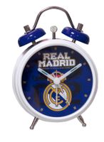 Zegar z funkcją budzika Real Madryt. Fantastycznie się prezentuje, został zaprojektowany i wykonany z dużą dbałością o detale. Prosty w obsłudze, działający na baterie i nakręcany z okrągłą tarczą ze wskazówkami w klasycznym stylu. Metalowe nóżki i dzwoneczki u góry dodają mu niesamowitego uroku. Możliwość nastawienia na alarm hymnu ulubionego klubu piłkarskiego.