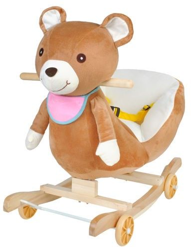 Zabawka wykonana jest z miękkiego i miłego w dotyku pluszu. Bujak jest wyposażony w kółka schowane na płozach, dzięki czemu szybko można go zmienić w wygodny jeździk.