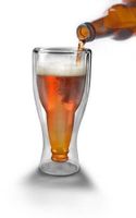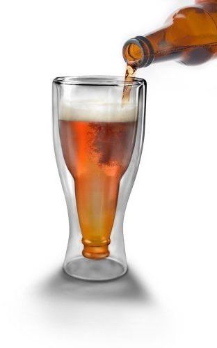 Napić się z kufla czy z butelki, to pytanie nurtuje niejednego smakosza piwa tuż przed przelaniem złocistego schłodzonego trunku ze szkła do własnego wnętrza. Dylemat ten wbrew pozorom nie jest łatwy do rozstrzygnięcia. Picie z butelki to taki naturalny, w przypadku mężczyzny wręcz instynktowny odruch. Sięgamy po chłodną butelkę, krótkie syczenie przy otwieraniu kapsla i już smakujemy to, co lubimy najbardziej (no może na drugim miejscu). Nalewanie powolne piwa do kufla świadczy natomiast o naszej ogładzie, dobrych manierach, obyciu i innych mało istotnych rzeczach. Pewien designer (bez wątpienia również piwosz) postanowił raz na zawsze rozwiązać ten problem i stworzył butelkowy kufel. W klasycznym kuflu czy raczej szklance do piwa zamknął odwrócona szyjką do dołu butelkę. W ten sposób powstało bardzo oryginalne, wesołe i praktyczne 2w1. Pijesz z kufla trzymając w ręku jednocześnie butelką. Taki butelkowy kufel ma jeszcze tę zaletę, że ma podwójne ścianki, co zapobiega szybkim nagrzewaniu się schłodzonej zawartości. Ponadto gdy wlejesz do niego bardzo chłodne piwo, to nasz kufel nie"spoci" się przez różnicę temperatur, a Ty zachowasz suche ręce i spodnie.