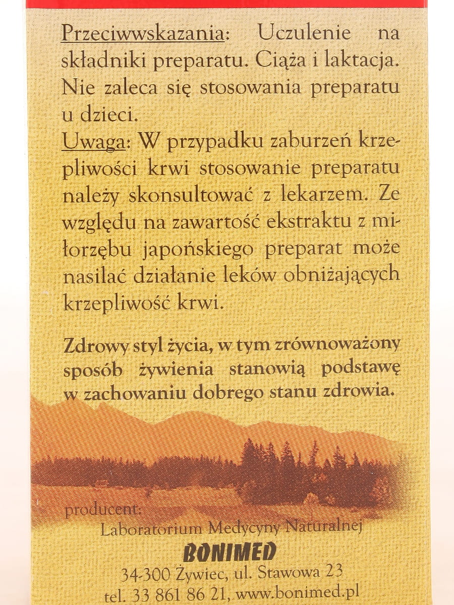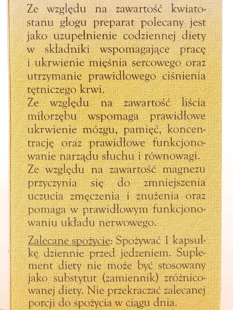 Zalecana do spożycia dzienna porcja produktu (1 kapsułka) zawiera: Ekstrakt z kwiatostanu głogu 120mg, ekstrakt z liści miłorzębu japońskiego 70mg,