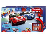 CARRERA CARRERA First Mini Cooper 63009 Tory wyścigowe Carrera 1.First! to zestawy pierwszych torów dla każdego małego pasjonata wyścigów! Rampy, pętle i skrzyżowania gwarantują, że najmłodsi kierowcy będą zachwyceni pełnymi akcji wyścigami! Elementy zestawów idealnie do siebie pasują, a dzięki szczegółowej i intuicyjnej instrukcji, montaż torów jest bardzo łatwy. Tory działają w ten sposób, że po podłączeniu do nich baterii, nie musimy już baterii montować w wyścigówkach. Pojazdy posiadają specjalne "szczotki stykowe" pod spodem, które stykają się z metalowymi "szynami" w torach. Posiadają pilota kontroli prędkości, który podłączany jest do torów. Zestaw "Carrera 1.First! Mini Cooper" zawiera: - 2 auta Mini Cooper, - 1 prosty odcinek toru - długi, - 2 proste odcinki toru - krótkie, - 1 prosty odcinek toru - krótki, przyłączeniowy (2 gniazda) wraz z miejscem na baterie, - 2 kontrolery prędkości, - instrukcję. Zabawka dla dziecka: 3 lata + Wymagana przestrzeń: 93 x 45 cm Zasilanie: x4 baterie C / LR14 (nie należy do wyposażenia) Waga (z opakowaniem): 0,80 kg