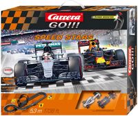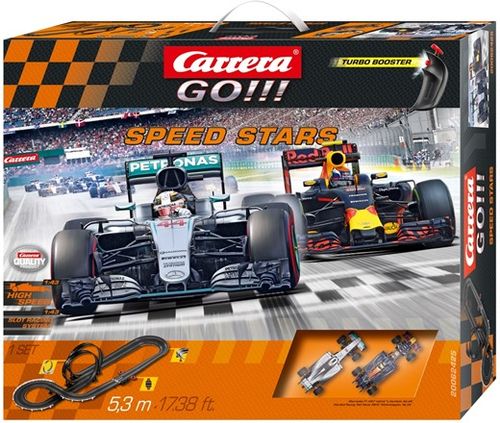 CARRERA GO!!! Speed Stars 62425 Carrera GO!!! to system startowy do Świata Wyścigów Carrera, stworzony w skali 1:43. Wszystkie zestawy z tej serii zawierają kontroler turbo doładowania, a także oryginalne, licencjonowane samochody, wykonane z ogromną dbałością o szczegóły. Do każdego z nich dołączony jest zawsze dodatkowy zestaw szczotek stykowych. Systemy torów są niezwykle łatwe w montażu i demontażu, dzięki unikalnemu systemowi zatrzasków. W zestawie znajduje się:- Racing TAG Heuer RB12 "M.Verstappen, No.33" (20064087) - F1 W07 Hybrid "L.Hamilton, No.44" (20064088) - 5 Prostych 342 mm, - 6 Proste 114 mm, - 4 Zakrętów 1/90°, - Dekoracje, - 1 Prosta z licznikiem, - 1 Szyna przyłączeniowa, - 1 Transformator, - 2 Kontrolery, - Zestaw wsporników, - Zatrzaski elementów toru, - Podkłady prowadzące, - Wymienne szczotki stykowe, - Zapasowe prowadnice, - 1x podwójna pętla - 4x zakręt pochyły 1/45° - Instrukcje. Zabawka dla dziecka: 6 lat + Pasuje do następujących serii: Carrera GO !!! Wymiary po rozłożeniu: 176 x 68 cm Długość toru: 5,3m Skala toru: 1:43 Skala pojazdów: 1:43 Efekty dźwiękowe: Nie Efekty świetlne: Nie Licencja: Red Bull Wymiary opakowania: 50,00 x 60,00 x 10,00 cm Waga (z opakowaniem): 3,05 kg