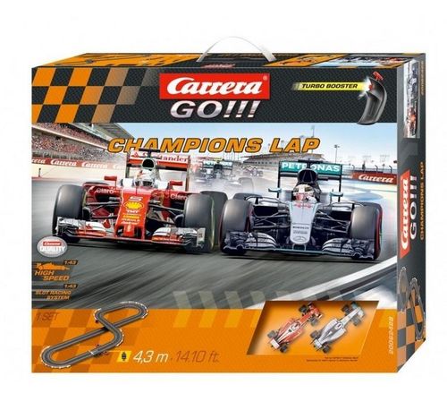 W zestawie znajduje się:-Ferrari SF16-H "S.Vettel, No.5" 64086-Mercedes F1 W07 Hybrid "L.Hamilton, No.44" 64088-1 Prosta z licznikiem-1 Szyna przyłączeniowa-1 Transformator-2 Kontrolery-Zestaw wsporników-Zatrzaski elementów toru-Podkłady prowadzące-Wymienne szczotki stykowe-Zapasowe prowadnice-InstrukcjeRozmiary po rozłożeniu: 183 x 80 cmDługość toru: 4.3 mCarrera GO!!! to system startowy do Świata Wyścigów Carrera, stworzony w skali 1:43. Wszystkie zestawy z tej serii zawierają kontroler turbo doładowania, a także oryginalne, licencjonowane samochody, wykonane z ogromną dbałością o szczegóły. Do każdego z nich dołączony jest zawsze dodatkowy zestaw szczotek stykowych. Systemy torów są niezwykle łatwe w montażu i demontażu, dzięki unikalnemu systemowi zatrzasków.