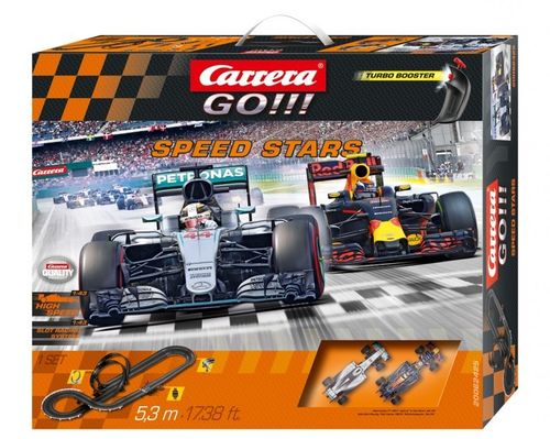 Max Verstappen i Lewis Hamilton to prawdziwi zawodowcy wyścigów samochodowych. Zestaw Carrera GO!!! Speed Stars pokazuje dwa bolidy angażujące się w brutalną walkę o zwycięstwo. Ten tor wyścigowy Carrera ma około 5,3 metra długości i wymaga od obu kierowców najwyższych umiejętności. Wysokiej prędkości proste, pętla i ostry zakręt są gwarancją rozrywki.