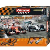 CARRERA GO !!! - Speed Run 62367 Carrera GO!!! to system startowy do Świata Wyścigów Carrera, stworzony w skali 1:43. Wszystkie zestawy z tej serii zawierają kontroler turbo doładowania, a także oryginalne, licencjonowane samochody, wykonane z ogromną dbałością o szczegóły. Do każdego z nich dołączony jest zawsze dodatkowy zestaw szczotek stykowych. Systemy torów są niezwykle łatwe w montażu i demontażu, dzięki unikalnemu systemowi zatrzasków. W zestawie znajduje się: - 1 Ferrari F14 T "F.Alonso, No.14" (20064028), - 1 Mercedes-Benz F1 W05 Hybrid "L.Hamilton, No.44" (20064039), - 5 Prostych 342 mm, - 8 Zakręty 1/90°, - 1 Prosta z licznikiem, - 1 Szyna przyłączeniowa, - 1 Transformator, - 2 Kontrolery, - Zestaw wsporników, - Zatrzaski elementów toru, - Podkłady prowadzące, - Wymienne szczotki stykowe, - Zapasowe prowadnice, - Instrukcje. Tor pasuje do następujących systemów: Zabawka dla dziecka: 6 lat + Carrera: GO !!! Wymiary po rozłożeniu: 175 x 122 cm Długość toru: 6,3 m Skala toru: 1:43 Skala pojazdu: 1:43 Efekty świetlne: Nie Efekty dźwiękowe: Nie Licencja: Ferrari , Mercedes GP Wymiary opakowania: 50,00 x 60,00 x 10,00 cm Waga (z opakowaniem): 2,65 kg