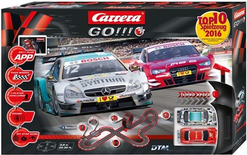 CARRERA GO!!!+ TOR - DTM Trophy 66000 Carrera GO!!! To system startowy do Świata Wyścigów Carrera, stworzony w skali 1:43. Wszystkie zestawy z tej serii zawierają kontroler turbo doładowania, a także oryginalne, licencjonowane samochody, wykonane z ogromną dbałością o szczegóły. Do każdego z nich dołączony jest zawsze dodatkowy zestaw szczotek stykowych. Systemy torów są niezwykle łatwe w montażu i demontażu, dzięki unikalnemu systemowi zatrzasków. W zestawie znajdują się: Audi A5 DTM "M.Molina, No.20" (20064042) AMG Mercedes C-Coupe DTM "D.Juncadella, No.12" (20064052) instrukcja 4 x wymienne szczotki stykowe 6 x podpory zakręt pochyły szuna Pitstop 1 x szyna przyłączeniowa GO!!! + 2 x kontolery GO!!! + 1 x pętla 1 x zasilacz Zabawka dla dziecka: brak + Skala toru: 1:43 Skapa Samochodu: 1:43 Wymiary Toru: 214 x 128 cm Długośc Toru: 6,80 Waga (z opakowaniem): 3,00 kg