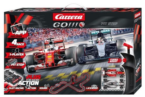 Kiedy dwóch mistrzów świata Formuły 1 pojawi się na starcie w nowym zestawie Formuły 1 Carrera GO!!! Plus Pit Stop, gwarantowana jest akcja na najwyższym poziomie. Automatyczny tor wyścigowy o długości 6,8 metra oferuje niespodzianki dla Lewisa Hamiltona i Sebastiana Vettela z zapierającą dech w piersiach pętlą, prostymi, które aż zapraszają do dociśnięcia drążka i wymagającymi przelotami. Niemiec Sebastian Vettel przybywa ze swoim Ferrari SF16-H, który odróżnia się od poprzedniego modelu szczególnie przednią częścią. Mercedes F1 W07 Hybrid zagwarantował już Lewisowi Hamiltonsowi tytuł mistrza. Ponadto gra Pit-Stop udostępnia zadania wymiany opon, przeglądu silnika czy tankowania, jak również darmową aplikację działającą za pośrednictwem szyny łączącej GO!!! Plus z zabawnymi grami, które oferują małym graczom podniecające wyzwania.