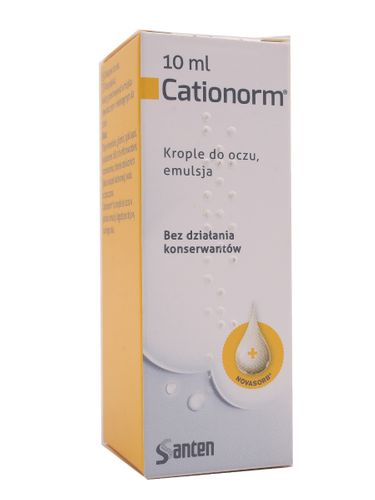 | | | | Stosowanie: |  | 1 kropla do każdego oka, 1 do 4 razy dziennie. Odchylić głowę do tyłu. Delikatnie wycisnąć jedną kroplę do oka i zamrugać. Cationorm może być stosowany łącznie z soczewkami kontaktowymi. Nie stosować po upływie trzech miesięcy od pierwszego otwarcia.