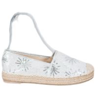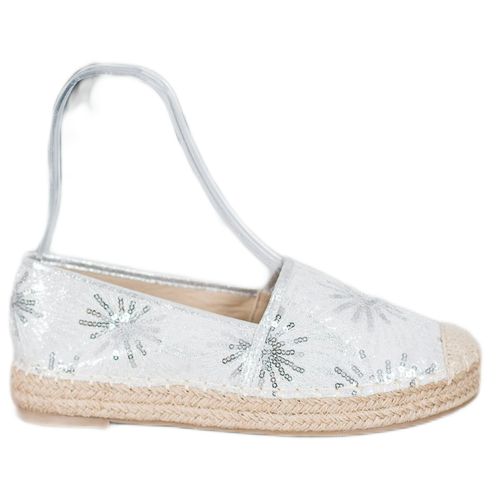 Damskie espadryle z cholewką przygotowaną z jasnoszarej tkaniny. Na całej powierzchni buty mają ułożony delikatny wzór z cekinów. Noski są zaokrąglony i mają wzmocnienie w postaci sznurka, którym również opleciona jest 3-centymetrowa platforma. Spodnią część zajmuje syntetyczna podeszwa, w której wyżłobiony został bieżnik.