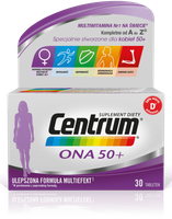 Kobiety i mężczyźni po 50. roku życia mają różne zapotrzebowanie na witaminy i minerały. Na podstawie najnowszej wiedzy z zakresu żywienia, nasi eksperci opracowali odpowiednio zbilansowany suplement diety Centrum Ona 50+. Jest to starannie dobrany zestaw witamin i minerałów dostosowany do potrzeb kobiet w średnim wieku.