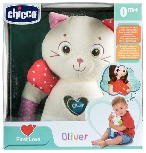 First Love: wyjątkowa więź, która trwaOliver to miękki i słodki kotek - przytulanka. Idealny na pierwszego przyjaciela Maleństwa. Do kotka dołączone jest plastikowe serduszko zawierające mini-grzechotkę, którą mama nosiła w naszyjniku na piersi podczas ciąży. Maleństwo po raz pierwszy usłyszało dźwięk grzechotki w 20 tygodniu ciąży. Po urodzeniu rozpoznaje i pozytywnie reaguje na znajomy dźwięk. Naszyjnik z grzechotką nie bez powodu jest symbolem więzi mamy z dzieckiem, więzi która nigdy nie zanika, ale z momentem urodzenia dziecka przechodzi w inny wymiar, tak jak grzechotka z naszyjnika mamy przechodzi do zabawki dziecka.First Love to nowa linia pluszowych zabawek dedykowanych niemowlętom marki Chicco. Każdą zabawkę z serii First Love można wypełnić mini-grzechotką, którą nosiła mama w naszyjniku przez cały okres ciąży. Dzięki temu dziecko wciąż doświadcza znanych, kojących odgłosów znanych mu z życia pod sercem mamy. To wyjątkowa więź, która trwa.Po usunięciu serduszka-pojemnika na mini-grzechotkę, zabawkę można prać w pralce.Wyjątkowy symbol łączącej Was więziMini-grzechotka z naszyjnika mamy przechodzi do zabawki dziecka - to najlepiej symbolizuje niezwykłą wieź między mamą, a jej dzieckiem.Wypełnij serduszko mini-grzechotką z naszyjnika mamyZwykła zabawka staje się wyjątkową zabawką dziecka - otwórz plastikowe serduszko i umieść w nim mini-grzechotkę z naszyjnika, który nosiłaś bedąc w ciąży. Dziecko rozpozna znajome dźwięki.Rozbudza dziecięce uczuciaPełna pozytywnych uczuć relacja z dzieckiem pomaga mu rozpoznawać i kształtować jego uczucia, osobowość i wprowadza go w świat relacji emocjonalnych, w które wejdzie później.Można prać w pralceTo niezwykle praktyczne, zwłaszcza dla rodziców noworodków i niemowląt, dla których czystość i higiena jest szczególnie istotna.Wiekod 0 miesięcyWymiaryp16 x 25 x 8 cm/p