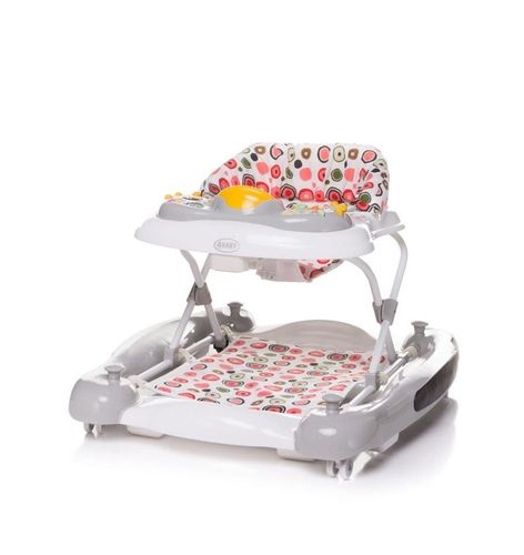 Dużym atutem jest możliwość przekształcenia w bujak/kołyskę z dołączaną matą podpierającą nóżki dziecka, regulowane siedzisko oraz oddychająca i plamoodporna tapicerka. Bezpieczeństwo dziecka zapewnią skrętne silikonowe kółka ze stoperami.