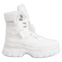 Ciepłe botki z podwyższonymi cholewkami mają biały kolor i dodadzą sportowego charakteru wielu różnym stylizacjom. Buty te mają koturny o wysokości 6 cm z 4-centymetrowymi platformami z przodu, dzięki czemu są wygodne podczas chodzenia. Cholewki wykonane z tworzywa skóropodobnego mają sznurowanie oraz pasek ze sprzączką.
