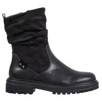 Damskie botki w czarnym kolorze z przymarszczanymi cholewkami sięgającymi za kostkę wykonane są z ekologicznej skóry i częściowo mają zamszowe wykończenie. Buty te mają solidne podeszwy z niewielką platformą oraz szeroki obcas o wysokości 4 cm, dzięki czemu są wygodne nawet podczas dłuższego chodzenia.