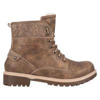 Wytrzymałe damskie trapery z ociepleniem wewnątrz. Cholewka ma kolor brązowy, a między nią a podeszwą znajduje się beżowy pasek. Buty wyposażone są w sznurowadła oraz płaski 4-centymertowy korek. Poza tym syntetyczna podeszwa ma gruby bieżnik. Na górze cholewki oraz na zapiętku przyszyty jest dekoracyjny materiał w innym kolorze.