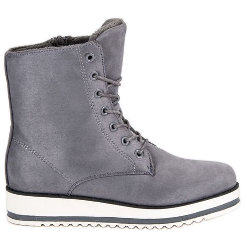 Wiązane botki w kolorze szarym to bardzo wygodne i ciepłe buty. Oprócz sznurowania mają suwak, dzięki czemu można je szybko założyć i zdjąć. Buty te są ocieplone mięciutkim futerkiem, dzięki czemu doskonale chronią stopy przed zimnem. Botki są wykonane z zamszu ekologicznego i mają niewielką platformę.