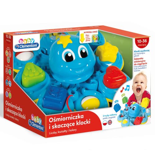 Ośmiorniczka i skaczące klocki to sympatyczna, rozpoznająca kształty ośmiornica, z której wyskakują kolorowe klocki. Dziecko pozna nazwę i kolor każdego kształtu, liczby w zakresie od 1 do 4 oraz podstawowe słowa w języku angielskim. Dzięki sznureczkowi maluszek zabierze ze sobą ośmiornicę w dowolne miejsce.