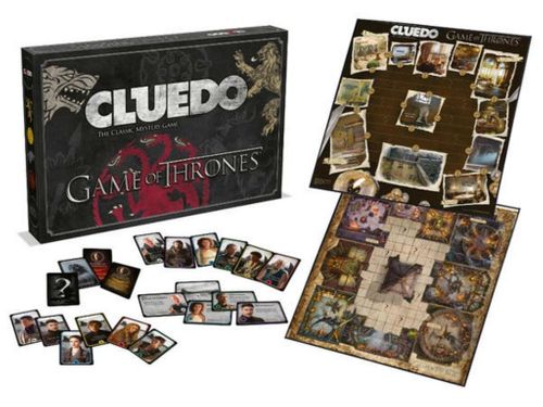 Cluedo Klasyczna gra detektywistyczna Gra o Tron. Gra zawiera: dwustronną planszę do gry, 6 różnych podstawek do pionków, 12 pionków podejrzanych, 12 kart osobowości, 38 kart plotek, 12 kart intryg, dwustronną kartę wskazówek, kopertę, 6 narzędzi zbrodni, 2 kostki, zasady gry. Ilość graczy: 2-6 graczy
