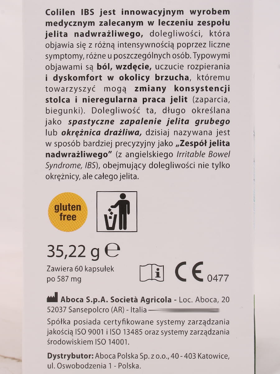 WSKAZANIA Colilen IBS jest zalecany w leczeniu zespołu jelita nadwrażliwego, charakteryzującego się bólem, wzdęciem, uczuciem rozpierania i dyskomfortem w okolicy brzucha, któremu towarzyszyć mogą zmiany konsystencji stolca i nieregularna praca jelit (zaparcia, biegunki lub na przemian). Colilen IBS, dzięki swojemu mechanizmowi ochronnemu, zmniejsza stopniowo dolegliwości jelitowe i, w zależności od nasilenia zaburzeń, zaleca się kontynuowanie leczenia od 2 do 6 tygodni oraz jego powtórzenie w razie ponownego pojawienia się pierwszych objawów.