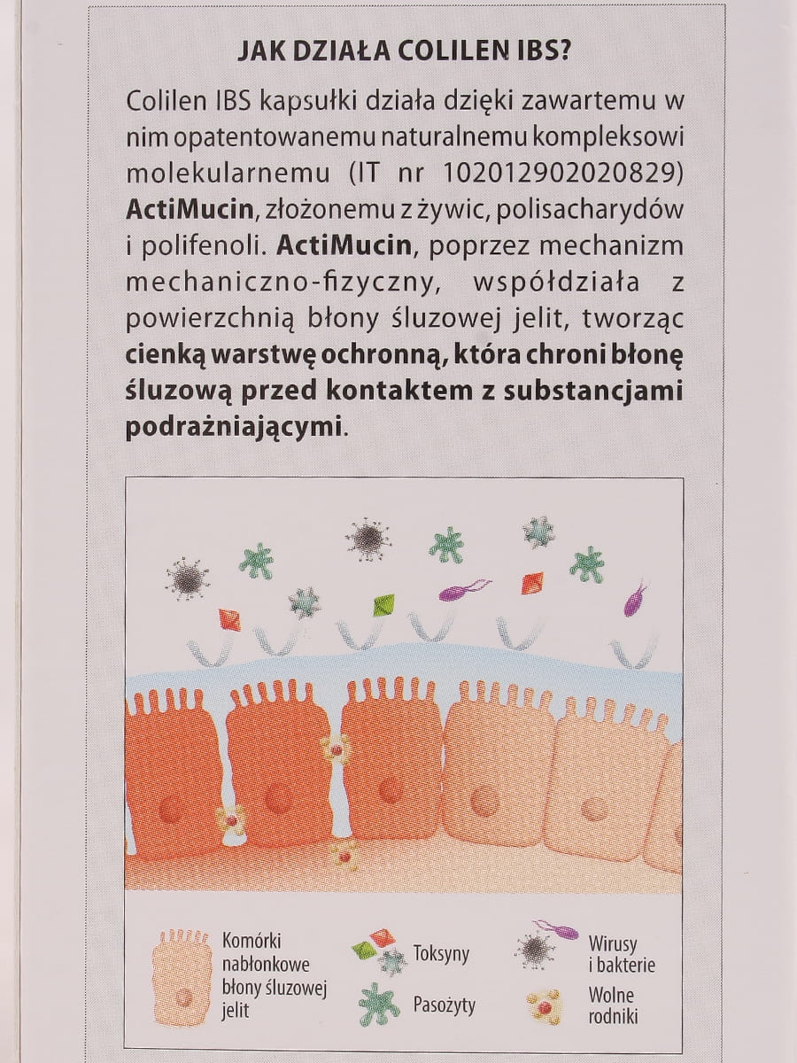 JAK DZIAŁA Colilen IBS kapsułki działa dzięki zawartemu w nim opatentowanemu kompleksowi molekularnemu (IT nr 102012902020829) ActiMucin, złożonemu z żywic, polisacharydów i polifenoli. ActiMucin, poprzez mechanizm mechaniczno-fizyczny, współdziała z powierzchnią błony śluzowej jelit, tworząc cienką warstwę ochronną, która chroni błonę śluzową przed kontaktem z substancjami podrażniającymi.