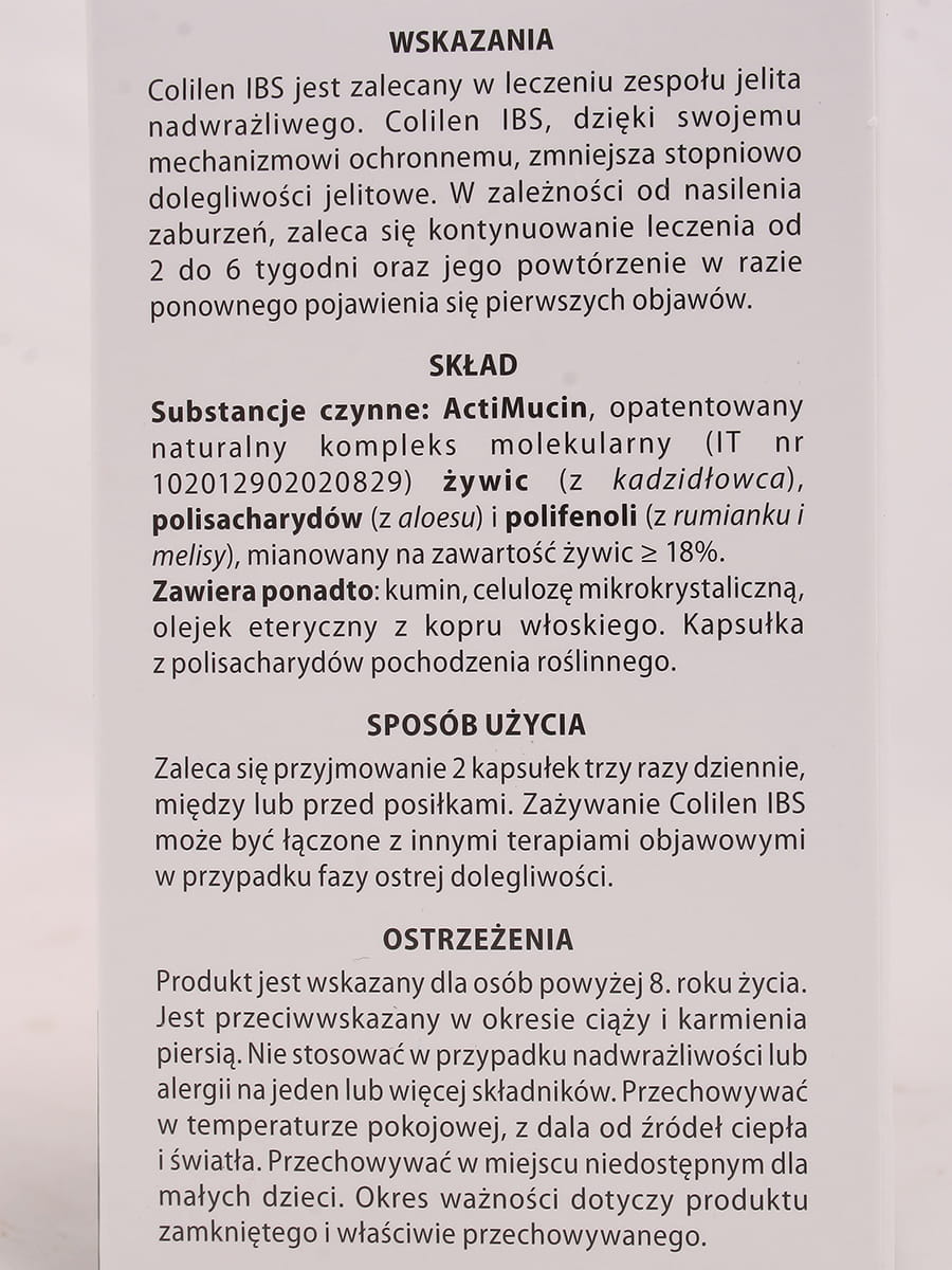 | | | | Stosowanie: |  | Zaleca się przyjmowanie 2 kapsułek trzy razy dziennie, między lub przed posiłkami. Zażywanie Colilen IBS może być łączone z innymi terapiami objawowymi w przypadku fazy ostrej dolegliwości.