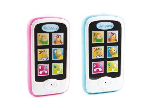 Zabawkowy, grający smartphone zawierający 6 interaktywnych przycisków.