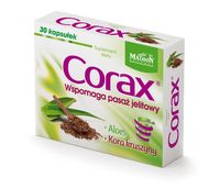 Zawarte w suplemencie diety Corax® naturalne ekstrakty roślinne sproszkowany sok z aloesu oraz ekstrakt z kory kruszyny wspomagają perystaltykę jelita grubego oraz przyspieszają pasaż jelitowy.