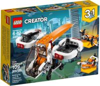 Wykonuj tajne misje i odkrywaj nieznane tereny w Dronie badawczym z pomarańczowych, białych i czarnych klocków. Model ma mnóstwo realistycznych detali, w tym dwa śmigła i ruchome kamery. Ma też duży, otwierany kokpit i podwozie, które służy również jako chwytak. Ten zestaw do budowania z serii LEGO® Creator 3 w 1 można przebudować na motorówkę bagienną lub samolot śmigłowy, by przeżyć jeszcze więcej emocjonujących przygód.