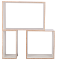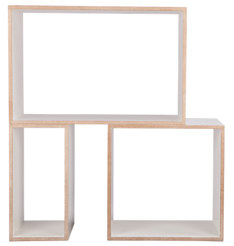 Zestaw trzech skrzynek do budowy regału. Kwadraty i prostokąty pozwalają na dowolne rozmieszczenie elementów w obrębie regału. Skrzynie ustawiać można na dwóch rodzajach podstaw długiej do budowy regału lub krótkiej, z której powstać może stolik, szafka nocna, lampa. Dodatkowe elementy z kolekcji CUBES takie jak lampy i głośnik bluetooth również służą do zabudowy i można je dowolnie konfigurować z zestawem skrzynek.