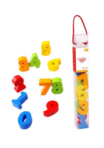 10 drewnianych cyferek to elementy wystarczająco duże, by dziecko mogło wygodnie trzymać je w swoich małych rączkach. Zadaniem dziecka jest nawlekanie ich na dołączone do zestawu sznureczki. Dziecko ćwiczy w ten sposób koncentrację, umiejętności manualne i koordynację ręka oko. Poznaje także kolory i uczy się liczenia.