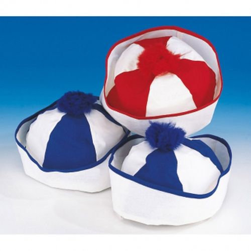 Czapka w kolorze białym z niebieskimi lub czerwonymi wstawkami. Czapka wykonana jest z materiału z pomponem na czubku. Obwód głowy - ok. 60 cm. Rozmiar uniwersalny dla dorosłych.