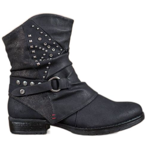 Bikery damskie mają cholewki sięgające za kostkę z wygodnym zapięciem na suwak od wewnętrznej strony. Buty te mają nietypowe cholewki w uniwersalnym czarnym kolorze, z ozdobnymi metalicznymi dżetami, dlatego będą pasować do różnych stylizacji dodając im charakteru, a szeroki obcas o wysokości 3 cm zapewni wygodę.