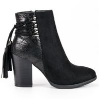 Piękne eleganckie botki to świetny wybór dla każdej kobiety czującej się świetnie w stylu boho. Buty są na wysokim korku, dzięki czemu optycznie wydłużają i wyszczuplają nogi. Stworzone są z połączenia materiałów. Wzór zwierzęcy bardzo przyciąga uwagę. Uroku dodają paski zakończone frywolnie wiszącymi frędzlami.