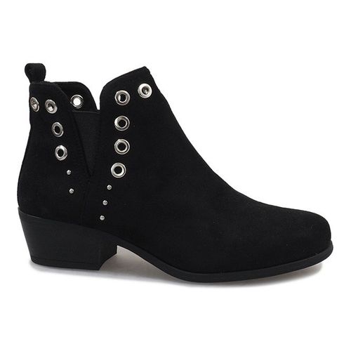 Damskie botki w kolorze czarnym wykonane są z ekologicznej skóry zamszowej. Szerokie 4,5-centymetrowe obcasy i tekstylne wkładki sprawiają, że model ten jest wygodny nawet podczas dłuższego chodzenia. Buty te są wsuwane, a ich cholewki sięgające za kostkę zostały ozdobione okrągłymi dżetami z dziurkami.