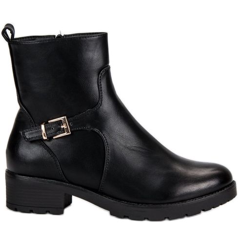 Czarne botki J. Star z ozdobną klamrą to klasyczne buty damskie na płaskim obcasie przeznaczone do codziennego użytku w sezonie jesienno-zimowym. Wykonano je ze skóry ekologicznej. Posiadają usztywniony zapiętek oraz podeszwę z bieżnikiem z tworzywa sztucznego. Wewnątrz znajduje się wkładka oraz ocieplenie z kożuszka.