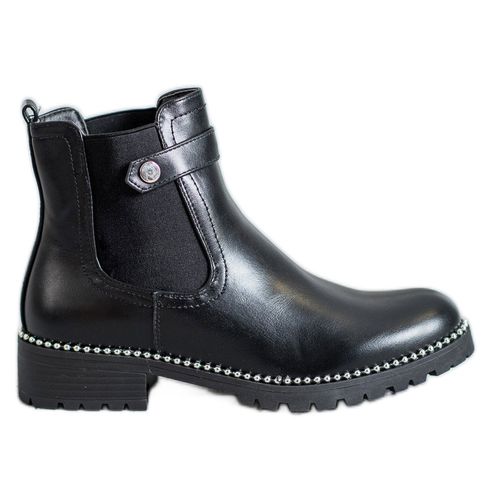 Sztyblety wykonane z ekologicznej skóry mają uniwersalny czarny kolor, dzięki czemu będą wspaniałym uzupełnieniem różnych stylizacji. Buty te są wsuwane, mają wstawki z elastycznych gumek ułatwiające wkładanie, szeroki obcas o wysokości 3,5 cm, ozdobny pasek z dżetami, a także koraliki wzdłuż podeszwy.