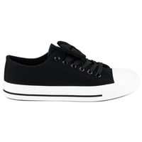 Do czarnych trampek dołączono u góry kokardkę w tym samym kolorze. Kobiecość tych butów jest więc od razu widoczna. Czerń została skontrastowana białym pełnym noskiem i białą podeszwą z gumy, na której u boku widnieje cieniutki czarny pasek. Zawsze bez problemowe sznurowadła upiększają buty i tym razem.